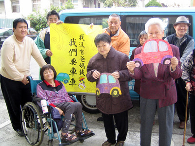 • 照片說明文字更新日期:2011/01/05 16:41 (中央社記者郝雪卿台中5 日電)台中市北區老人日間照顧中心接送老人的車輛不敷使用,無法服務更多老人,趁著年底換車潮,今天提出「舊車一輛、助老一千」,盼民眾換新車時能捐出舊車,造福更多老人。 公辦民營的北區老人日照中心,由台中市政府委託全成社會福利基金會經營,以提供社區老人就近照護為特色。中心督導李仁順表示,日照中心就像「托老所」,早上將長輩送到中心,由專人陪伴及照顧,晚上接回家,可以讓家人無後顧之憂,長輩獲得周全照護,不必再關在家裡孤獨無伴。 李仁順說,目前中心收容18人,因為大部分家屬無法親自接送老人家,還希望能趕在上班前,由中心派車將長輩接走,時間緊迫,但中心只有1輛7人座休旅車,載運人數有限,也分身乏術,造成很多想加入日照行列的長輩被拒門外,例如住在建成路一對老夫婦,就因中心沒有多餘車輛接送,無法得到社福資源照顧。 北區老人日照中心的爺爺、奶奶今天手持「我們沒有爸媽載,我們要車車」的大字報,還有五顏六色的汽車圖卡,向社會大眾傳達他們的需求。 李仁順說,中心希望結合社會資源,解決車輛不足問題,所以提出「舊車一輛,助老一千」呼籲,民眾只要捐助1輛舊車,1年可以造福1000人次以上長輩。 依照中心推算,1輛轎車每天可以接送4名老人,1個月有22天,一年約可服務1000人次。李仁順希望趁此波景氣回升,民眾年終獎金加碼,打算汰舊換新車之際,能為「舊愛」找到最好的去處。意者請洽(04)22354840。1000105